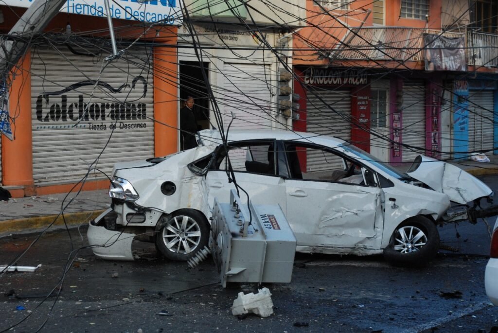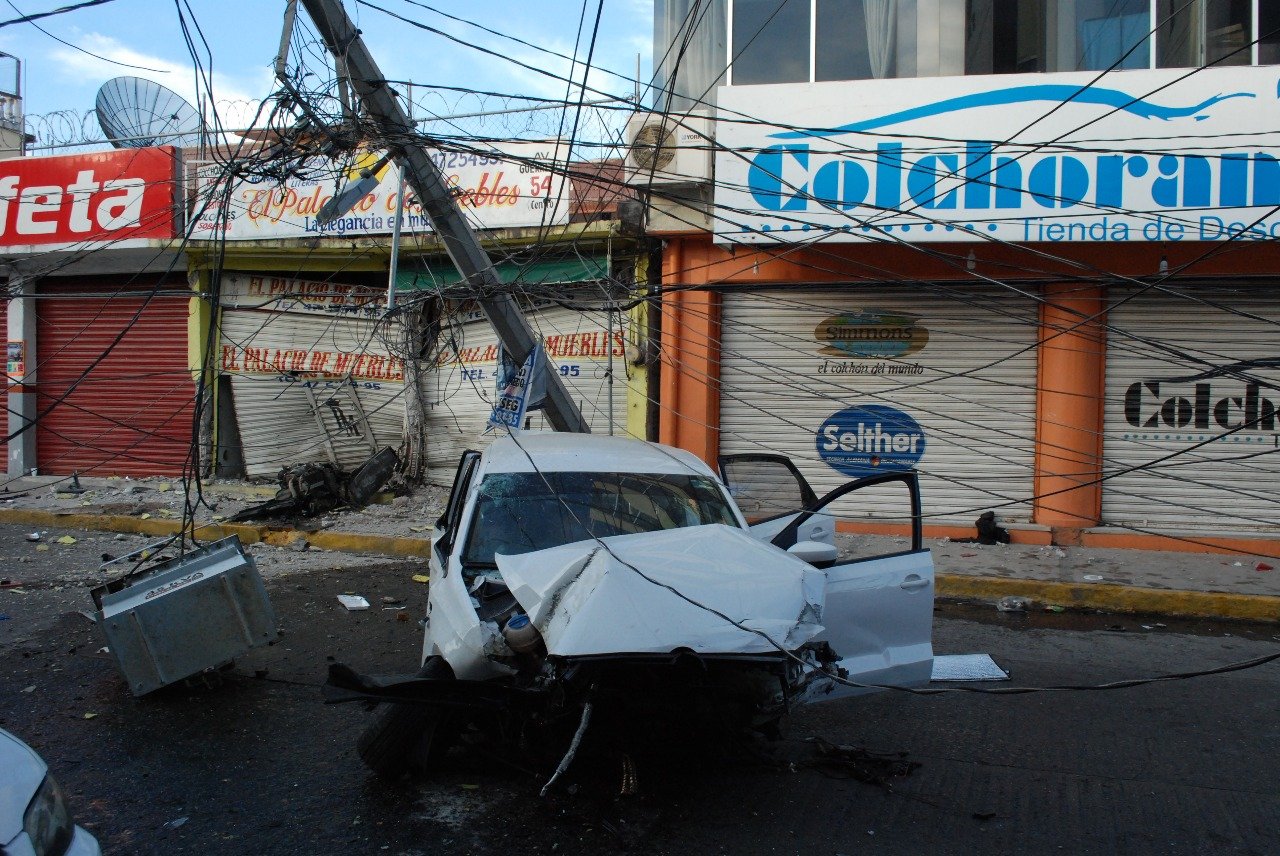 Esta mañana, se suscitó un aparatoso accidente automovilístico, sobre la Avenida Guerrero, a unas cuantas cuadras del centro de la ciudad; resulta que un automóvil Volkswagen Vento se impactó de frente contra un poste, propiedad de la Comisión Federal de Electricidad, sobre el que estaba instalado un transformador; tan potente fue el golpe que a la unidad se le desprendió el motor. Los tripulantes de la unidad (que según reportes se trataría de 4 sujetos) se dieron a la fuga, evadiendo todo tipo de responsabilidad, luego de dejar sin luz, durante varias horas, a las colonias circunvecinas.