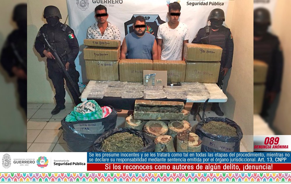 ACAPULCO. —Elementos del Primer Batallón de la Policía Estatal Acreditable detuvieron a tres sujetos que portaban una pistola, 109 kilos de marihuana y un total de 3 mil 164 dosis de diversas drogas, en la calle Juan N. Álvarez de la colonia Palomares.