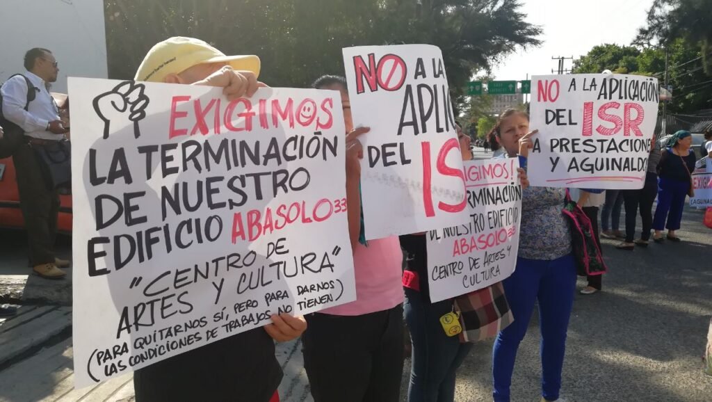 Ahí desde las 10:00 horas los trabajadores desplegaron una lona también para manifestar su rechazo a esta medida porque “lesiona nuestros derechos laborales, ya están gravados impositivamente nuestros salarios y ahora van a gravar también nuestros aguinaldos y prima de antigüedad por las que hemos luchado y que deberían de estar libres de cualquier impuesto”, afirmó una trabajadora.