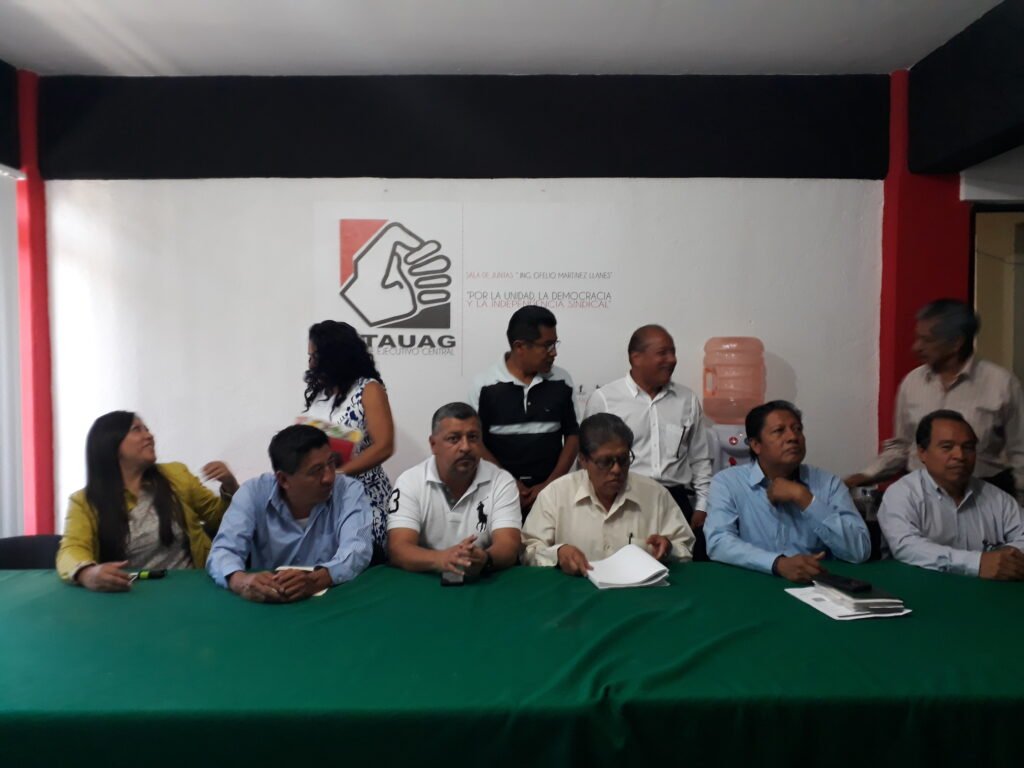En tanto en las oficinas del STAUAG, los dirigentes del Colectivo de Organizaciones ofrecieron una conferencia, ahí Arcángel Ramírez Perulero, dirigente de la Coordinadora Estatal de Trabajadores de la Educación en Guerrero (CETEG), dijo que en este tema “no debe haber una lucha aislada, son consecuencias de las reformas de este gobierno que no mejoran la vida de nadie, todo lo contrario y por eso exigimos respeto a los derechos de los trabajadores, quieren mayor sometimiento y explotación”.