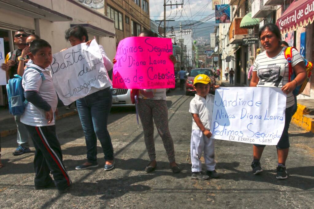 Padres de familia bloquearon el centro de Chilpancingo para exigir seguridad al gobierno del estado y municipal, ante el incremento de robos en el jardín de niños “Diana Laura Riojas de Colosio”, ubicado en la colonia Eduardo Neri.