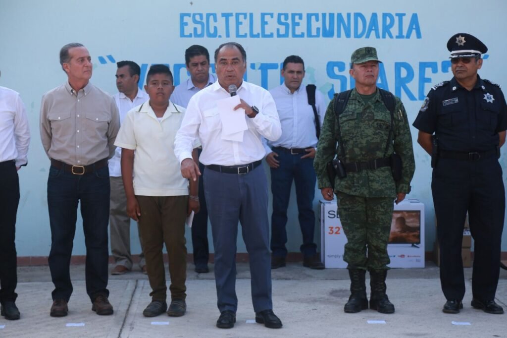 El gobernador tras escuchar al director de la Escuela Telesecundaria “Vicente Suárez”, Rafael Binicio Martínez, quien le dio la bienvenida y le agradeció que haya dado respuesta al problema de la seguridad, anunció apoyos adicionales para la escuela, además de que se tomarán acciones que permitan su desarrollo integral.