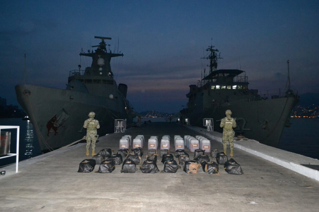 La Secretaría de Marina-Armada de México como Autoridad Marítima Nacional en Funciones de Guardia Costera, informa que ayer personal adscrito a la Fuerza Naval del Pacífico, Sexta y Octava Región Naval, realizó el aseguramiento de 24 bultos con un peso aproximado de 500 kilogramos de presunta droga a bordo de una embarcación menor, asimismo se detuvo a cinco personas frente a costas de Guerrero.