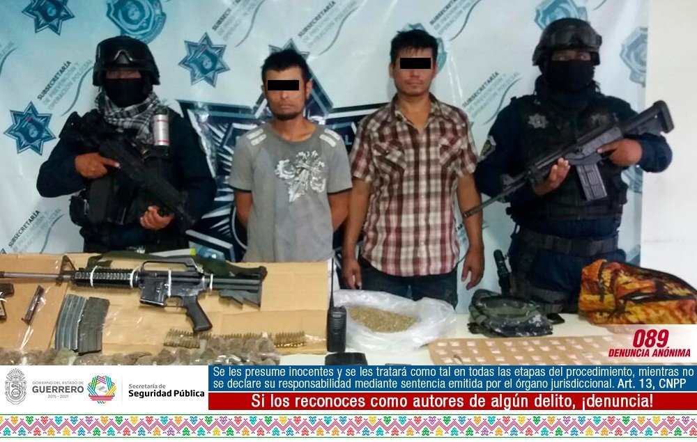 Policías Estatales, en coordinación con personal del Ejército Mexicano, aseguraron ayer en San José Ixtapa, municipio de Zihuatanejo a dos personas del sexo masculino en portación de armas de fuego de uso exclusivo del Ejército, Armada y Fuerza Aérea, probable droga y un radio de comunicación.