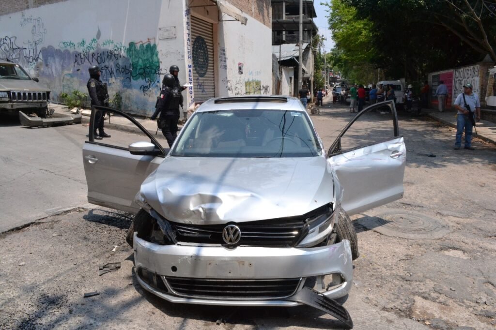 Durante la persecución, los policías aseguraron que fueron agredidos a balazos por el desconocido, quien en su loca chocó con dos taxis marcados con los números económicos 586 y 389, también dañó unas macetas que se encontraban sobre la banqueta y una camioneta marca Jeep, Cherokee, de color café.