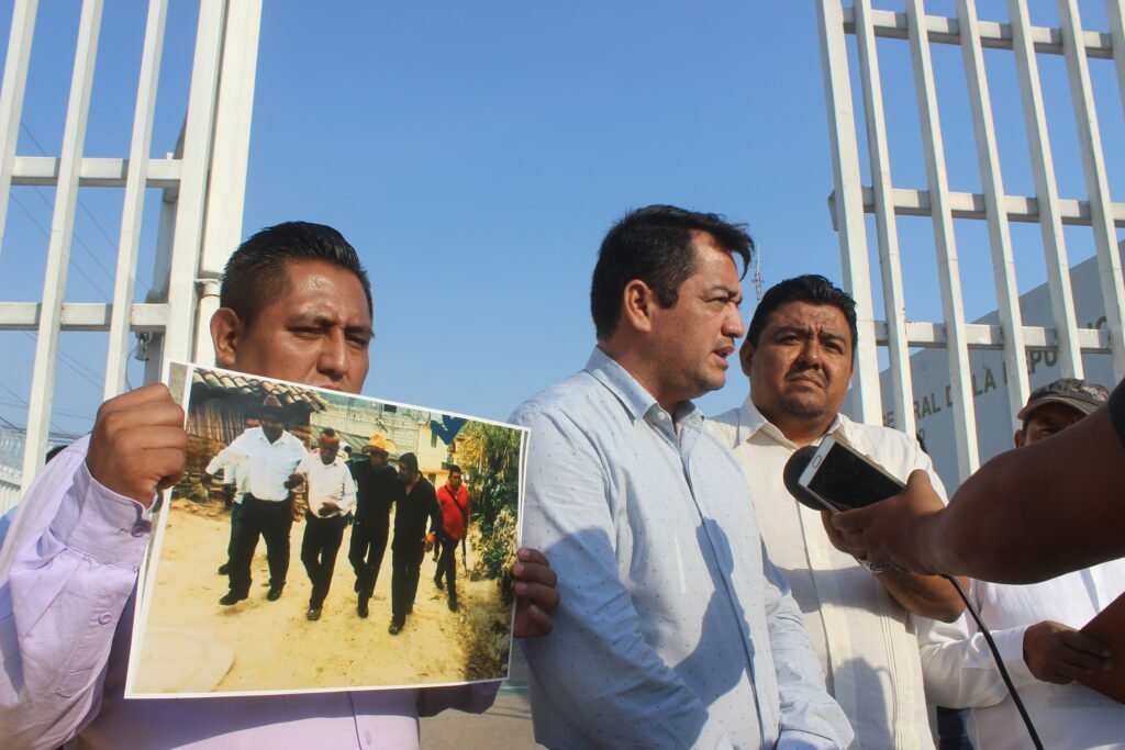 “En estas fotos que exhibimos el día de hoy están los responsables y principalmente el presidente municipal con licencia y actual candidato del PRI”, afirmó Moreno Peralta mientras señalaba las imágenes en las que aparece Larios Rosas resguardado por gente armada.