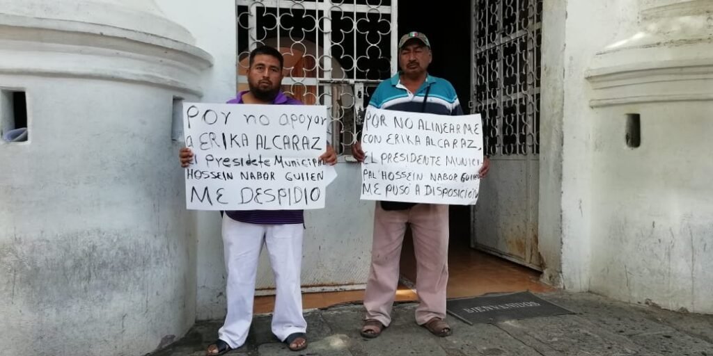 Los ahora ex trabajadores José Castrejón de la Cruz y Jorge Tlatempa Flores realizaron una protesta afuera de palacio municipal donde con pancartas denunciaron que “por no apoyar a Erika Alcaraz, el presidente municipal Hossein Nabor Guillén me despidió”.