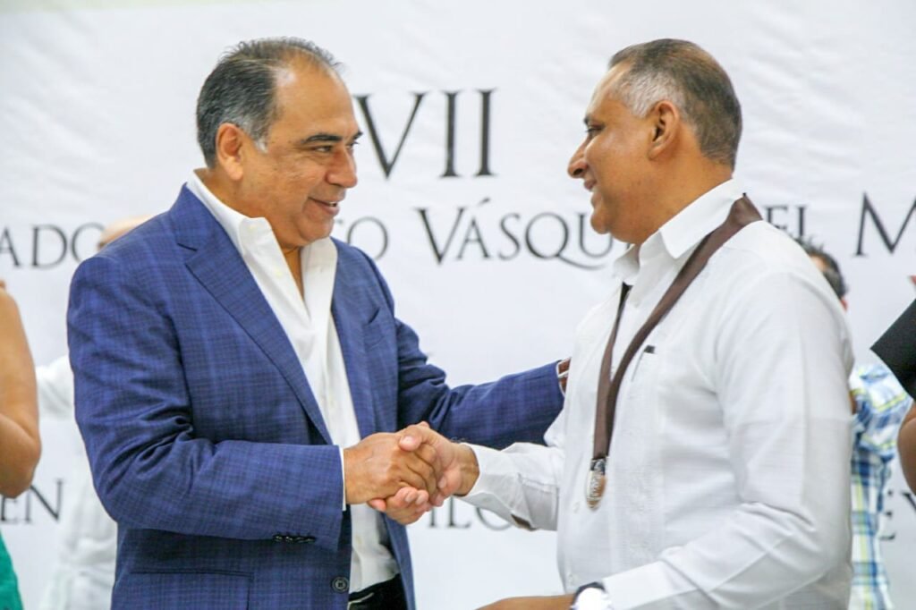 En el marco de esta conmemoración, el gobernador entregó las medallas al Mérito Jurídico 2018 “Licenciado Teófilo Olea y Leyva” y “Licenciado Alberto Vásquez del Mercado” a los juristas Luis Camacho Castañón y Carlos Marx Barbosa Guzmán, respectivamente, a quienes felicitó y reconoció el trabajo profesional de los galardonados y su fomento a la cultura de la legalidad en la entidad.