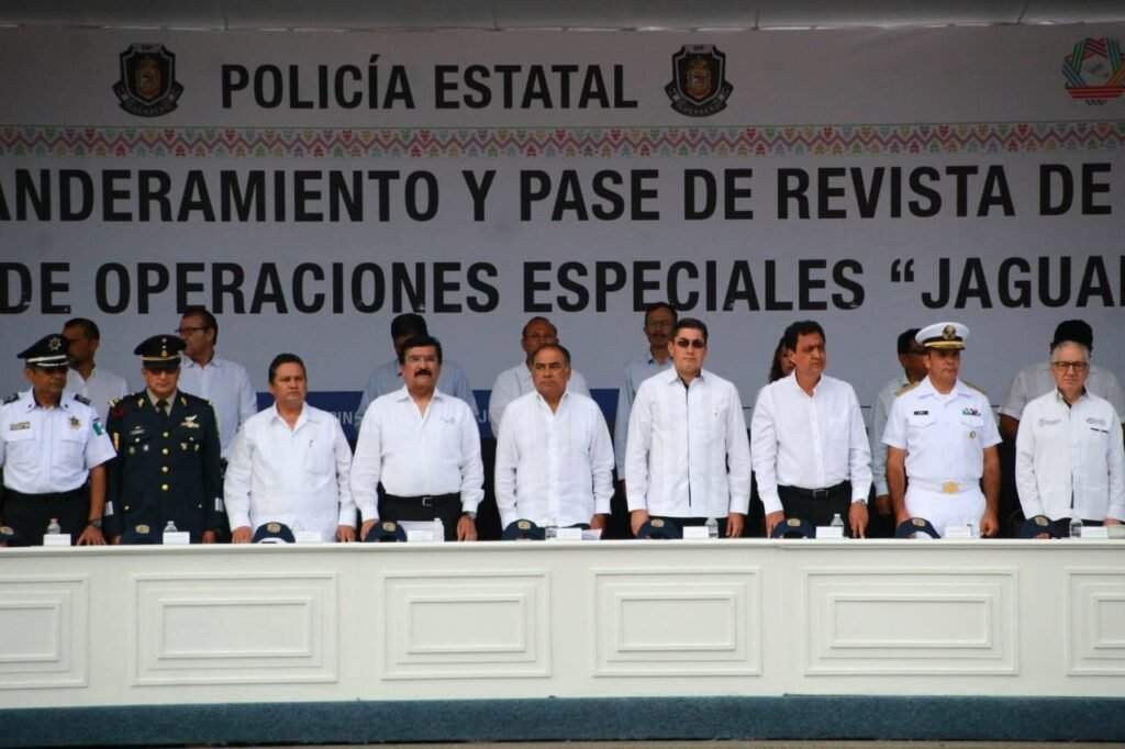 Durante la ceremonia de abanderamiento y pase de revista del Grupo de Operaciones Especiales Jaguar, el mandatario estatal insistió en la necesidad de construir 32 cuerpos de seguridad estatales con una línea de mando vertical, porque este esquema ayudaría a superar el descrédito social que enfrentan actualmente las corporaciones policiacas.