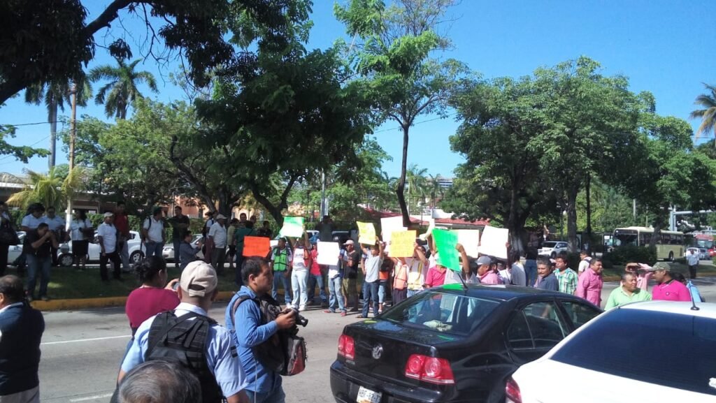 En una primera protesta, los trabajadores de la empresa Recolectora Sustentable de Guerrero pararon las labores de limpieza desde las 6:00 de la mañana y se ubicaron afuera del Palacio Federal, estacionando algunas unidades recolectoras de basura sobre la avenida Costera.