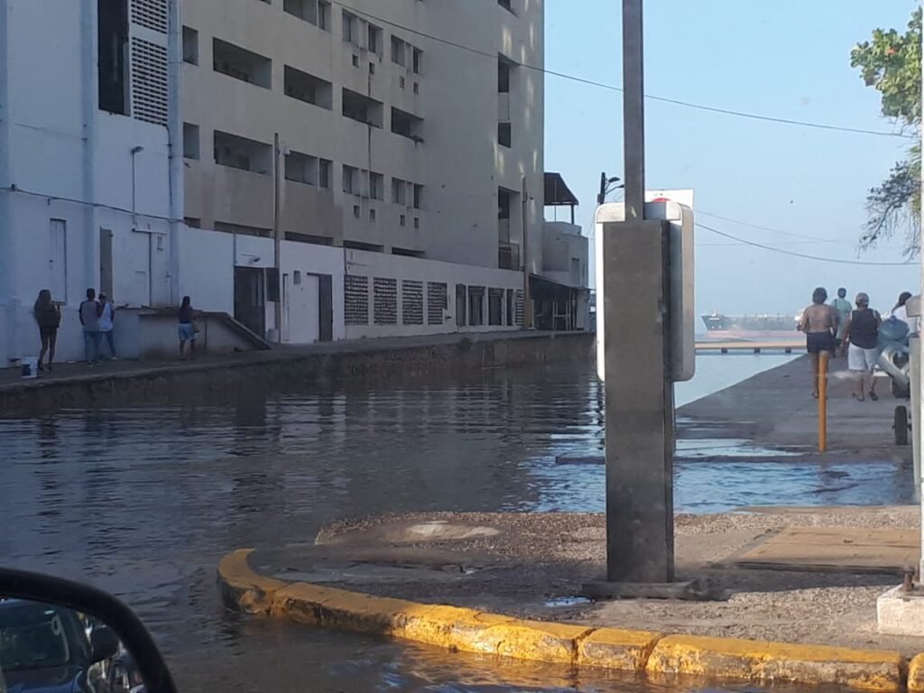 Por este fenómeno la mañana de ayer se registró alto oleaje y por consecuencia la salida del mar en la calle Juan de la Cosa, donde personal de la Coordinación realizó el acordonamiento del área con fin de que los automóviles no ingresen a esa área.