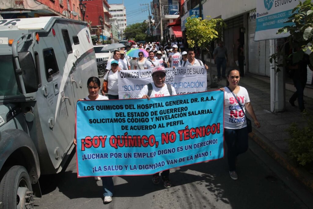 Por segunda ocasión, químicos marcharon por las principales calles y avenidas de Chilpancingo, y protestaron en el interior de las instalaciones de la Secretaría de Salud del estado (SSa), para exigir a esa dependencia el cambio de código de técnicos a químicos.