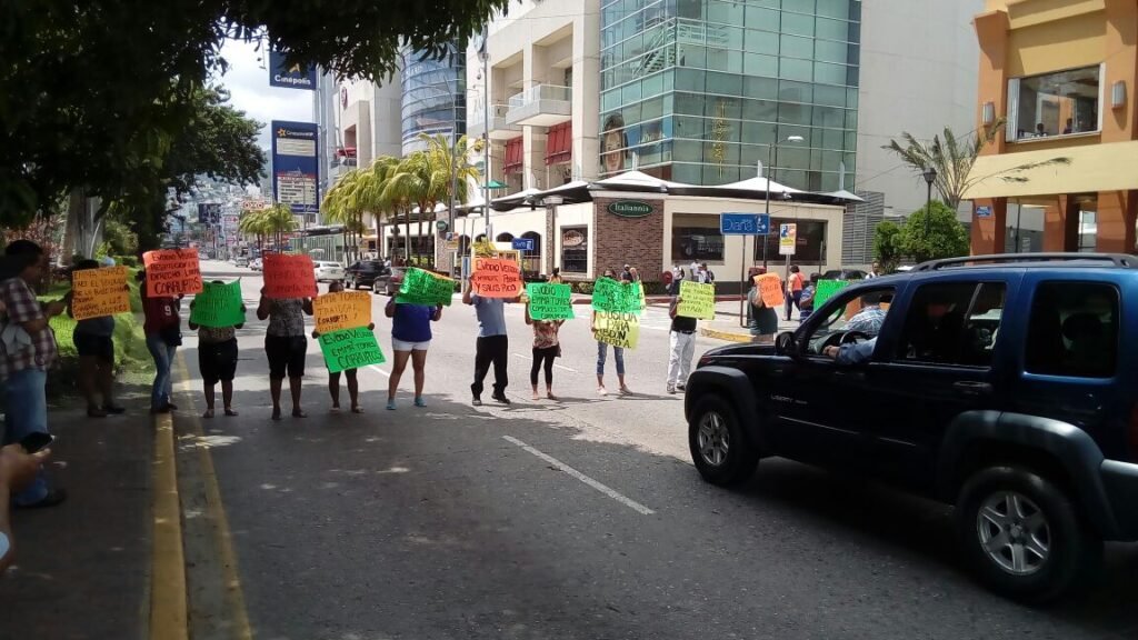 La protesta inició alrededor de las 2 de la tarde, cuando unas 10 personas con cartulinas en mano bloquearon de forma intermitente la principal avenida turística en el sentido Centro-Base, exigiendo la plaza sindical que le fue retirada al hijo de la exfuncionaria municipal.