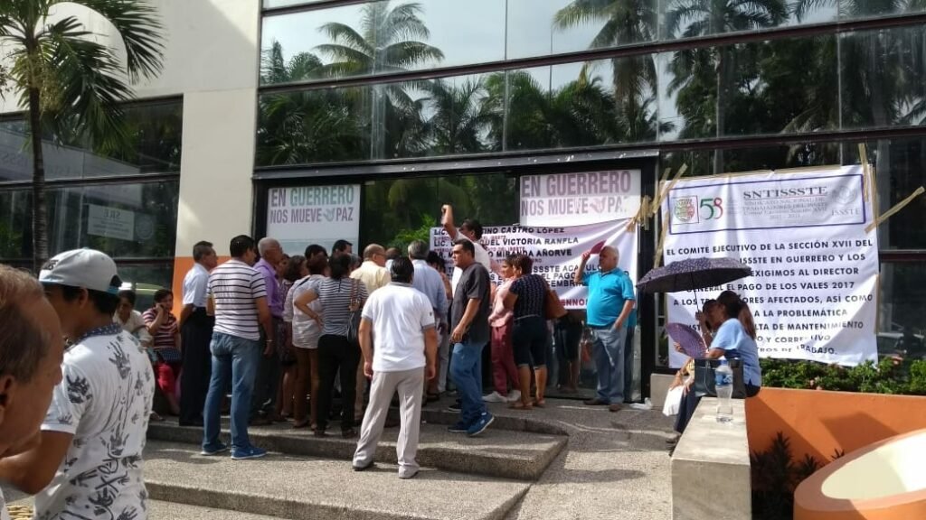 ACAPULCO.— Trabajadores sindicalizados del Instituto de Seguridad y Servicios Sociales de los Trabajadores del Estado (ISSSTE) protestaron afuera de la delegación estatal, ubicada sobre la costera Miguel Alemán, para exigir el pago de vales decembrinos del 2017.
