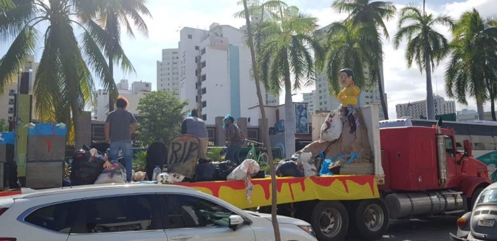 En una acción inédita, un grupo de ciudadanos contrató un tráiler con plataforma que hizo recorridos sobre la Costera Miguel Alemán, llevando a bordo un monigote con la figura de Evodio Velázquez y junto a él sacos con dinero y calaveras, haciendo alusión a sus desvíos financieros y el repunte de la violencia durante su gobierno.