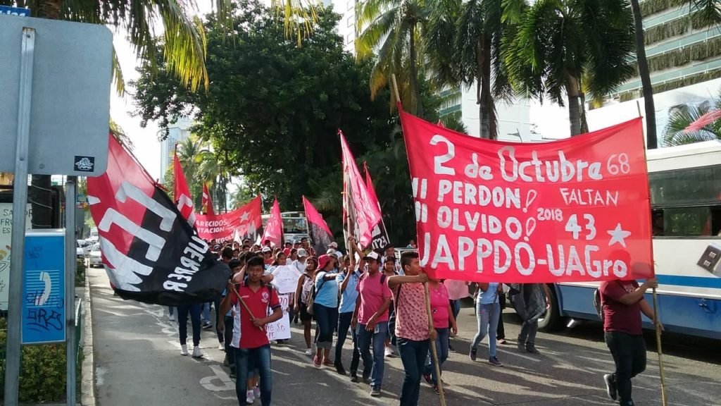 ACAPULCO.— Estudiantes de preparatorias populares de la Universidad Autónoma de Guerrero (UAGro) marcharon este martes por la costera Miguel Alemán, para conmemorar los cincuenta años de la matanza en la Plaza de las Tres Culturas de Tlatelolco, ocurrida en 1968 en la Ciudad de México.
