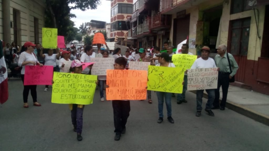 Desde ahí salieron en marcha con dirección al ayuntamiento. Durante el recorrido mostraron pancartas contra la directora de Recursos Humanos, Elizabeth Huitrón y lanzaron consignas contra el alcalde perredista Antonio Gaspar Beltrán.
