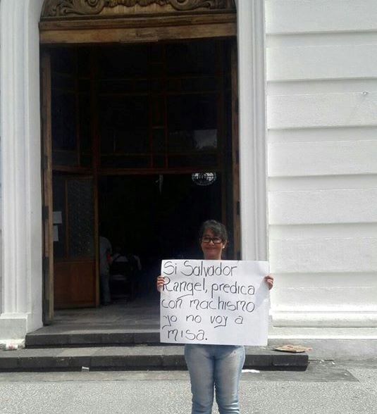 La feminista Wendy Alanís Gutiérrez se plantó afuera de la catedral con una cartulina que contenía el siguiente mensaje: “Si Salvador Rangel predica con machismo, yo no voy a misa”.