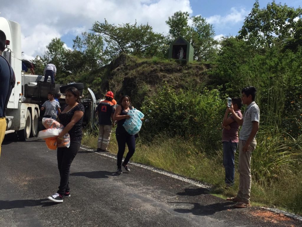 En redes sociales comenzó a trascender el accidente, así que vecinos y transportistas de las comunidades más cercanas se trasladaron a ese lugar y comenzaron a realizar la rapiña correspondiente, dejando la unidad vacía en cuestión de minutos