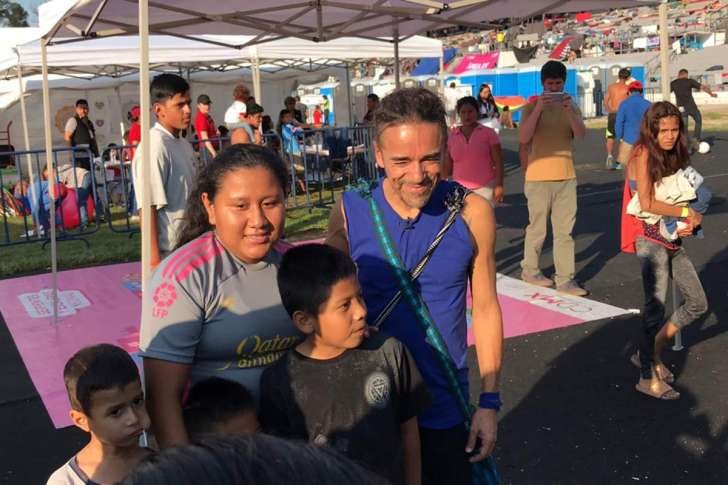 Integrantes del grupo Café Tacuba convivieron con la caravana de migrantes que se encuentra en el estadio de Jesús Martínez ‘Palillo’, en Ciudad Deportiva, alcaldía de Iztacalco.