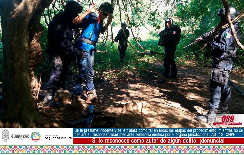 Policías Estatales detuvieron a un hombre que portaba un fusil AK-47, cargadores, cartuchos útiles, equipo táctico y marihuana en las inmediaciones de la localidad El Tibor, en el municipio de La Unión de Isidoro Montes de Oca.