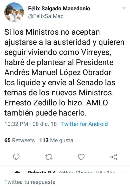 Salgado Macedonio planteó en su cuenta de Twitter: “si los Ministros no aceptan ajustarse a la austeridad y quieren seguir viviendo como Virreyes, habré de plantearle al Presidente Andrés Manuel López Obrador los liquide y envíe al Senado las ternas de los nuevos Ministros. Ernesto Zedillo lo hizo. AMLO también puede hacerlo”.