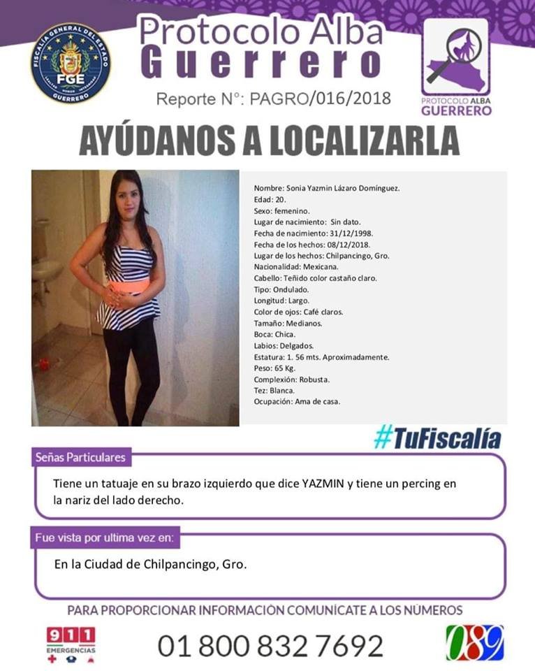 Por otro lado también se encuentra el caso de Sonia Yazmín Lázaro Domínguez, quien desapareció el pasado 08 de diciembre en esta capital. Como referencia, la mujer de 20 años cuenta con un tatuaje en su brazo derecho con su nombre y pircing en la nariz, del lado derecho. Se espera sea localizada.
