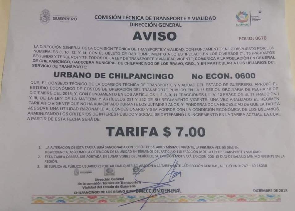 En ese documento con la litografía oficial del gobierno del estado se informa que el Consejo Técnico de Transporte y Vialidad en el estado de Guerrero aprobó el estudio socio económico de costos de operación del transporte público en la primera sesión ordinaria de fecha 10 de diciembre del 2018.