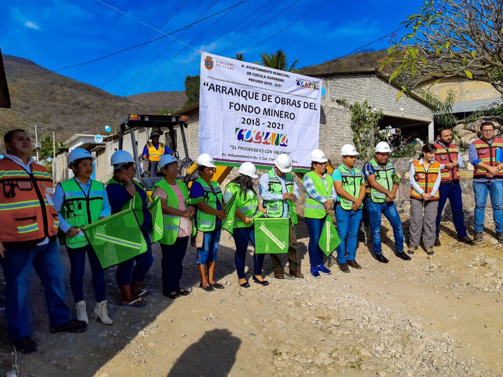 cocula, Guerrero; 16 de enero de 2019. Funcionarios de Cocula, encabezados por el alcalde Carlos Alberto Duarte Bahena, los superintendentes de Relaciones Comunitarias y Asuntos Públicos de la minera Media Luna, Bernarda Elizalde Andrews y José Luis Peralta Flores; y los presidentes de los Comités Ciudadanos de Desarrollo Comunitario y Participación (Codecop), encabezaron el arranque de doce obras en cinco comunidades de ese municipio que suman una inversión de 31 millones 104 mil 408 pesos del Fondo Minero 2017.