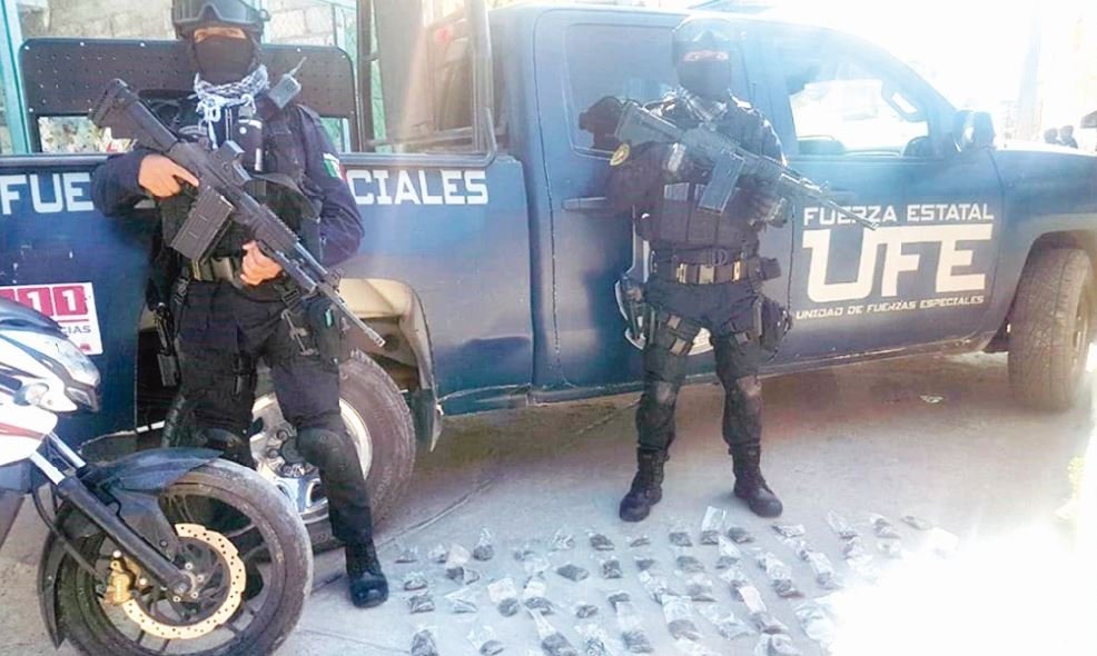 Elementos de la Unidad de Fuerzas Especiales de la Policía Estatal aseguraron una motocicleta y 100 bolsitas con marihuana en la calle Margarita Adame de la colonia Pino Suárez, en esta capital.