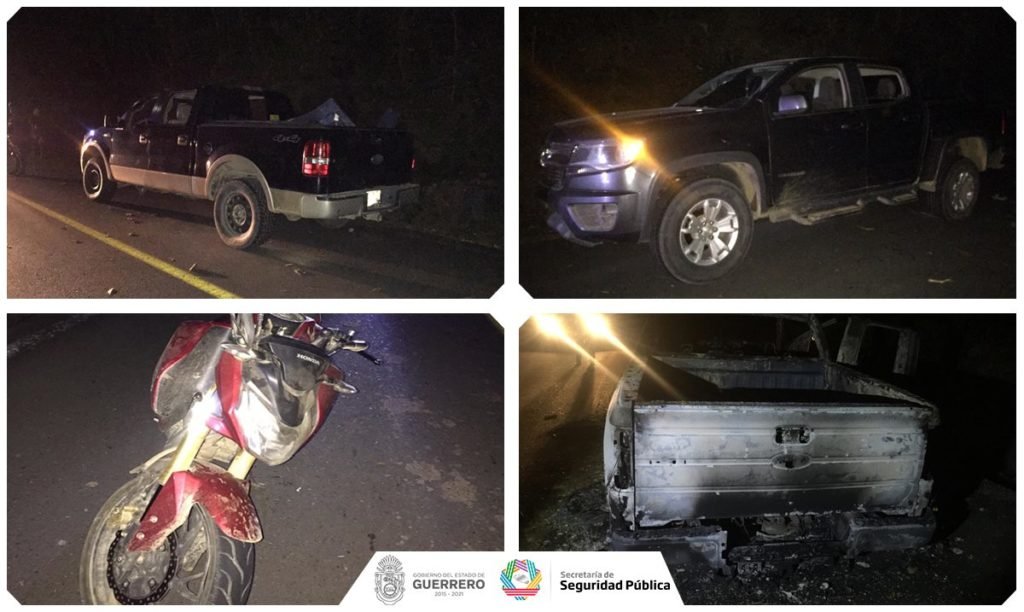 Agentes estatales y personal militar que iban hacia ese punto, localizaron sobre la carpeta asfáltica de la comunidad de Nueva Italia, tres camionetas, dos con reporte de robo y una incinerada, así como una motocicleta que también fue robada.