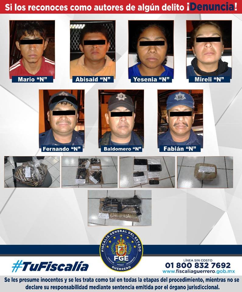 Las autoridades informaron que los elementos policíacos detenidos responden a los nombres de Baldomero “N”, Fernando “N”, Fabián “N” y Mireli “N”, mientras que los civiles se identificaron como Abisaid “N”, Yesenia “N” y Mario “N”, además de dos menores de edad.