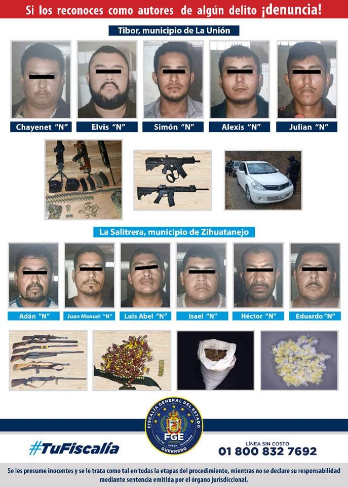 Posteriormente, en una segunda detención realizada por Policía Ministerial y Estatal en la localidad de La Salitrera, municipio de Zihuatanejo, se capturaron a 6 integrantes más, ellos son: Adán “N”, Juan Manuel “N”, Luis Abel “N”, Isael “N”, Héctor “N” y Eduardo “N”, asegurándoles armas de grueso calibre, escopeta 12 mm, un arma larga M1 carabina calibre 30 mm, una escopeta calibre 16 mm, arma larga M1 carabina y una escopeta calibre 16 mm, vehículos, 480 dosis de la droga conocida como “cristal” y marihuana.