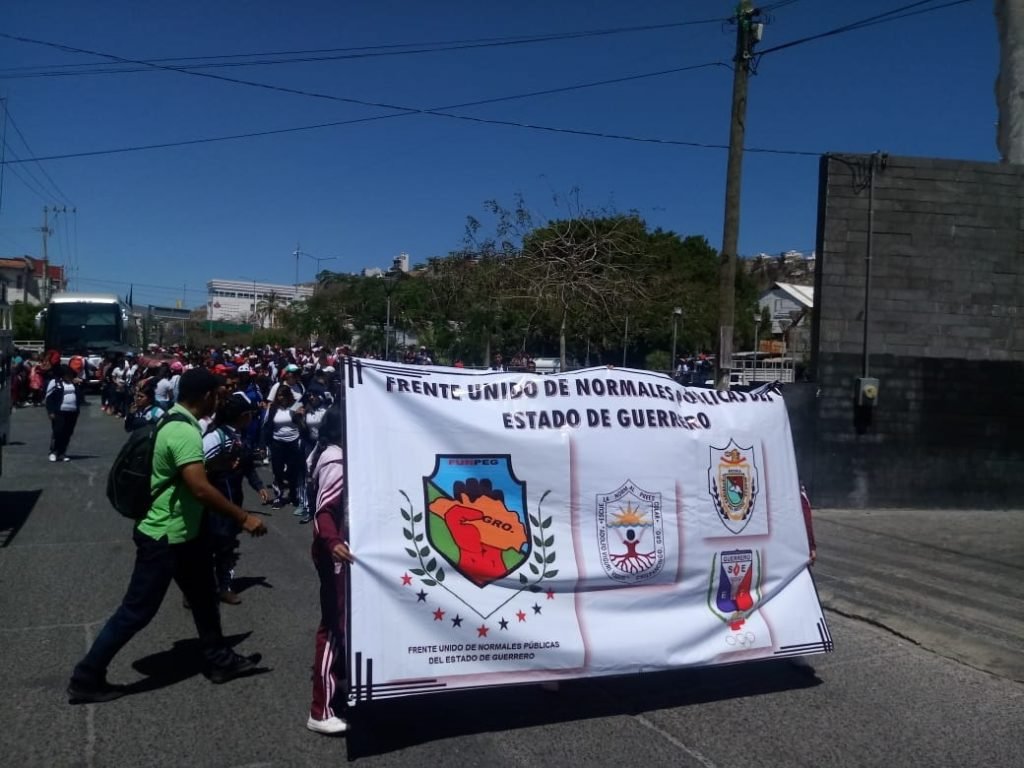 Unos 300 afiliados al Frente Único de Normales Públicas del Estado de Guerrero (FUNPEG), marcharon en esta capital para demandar el pago de becas, de materiales de trabajo en sus prácticas profesionales, el examen para ingresar al servicio social.