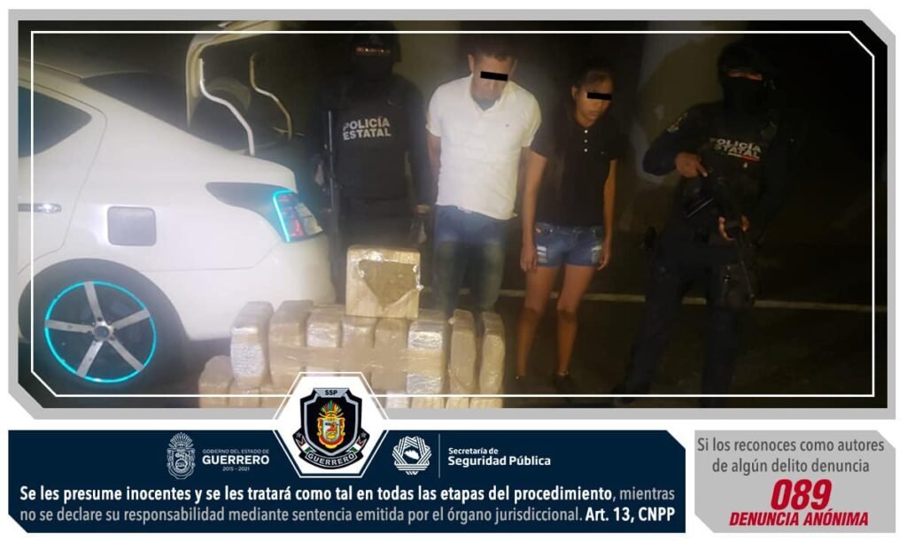Elementos de la Policía Estatal capturaron a un hombre y una mujer que portaban mil 80 dosis de “cristal”, 92 bolsitas y 19 paquetes de marihuana, con un peso total de 63 kilos, así como un vehículo del servicio público, en instalaron un puesto de vigilancia en la colonia Lomas de Riscalillo, en Zihuatanejo.
