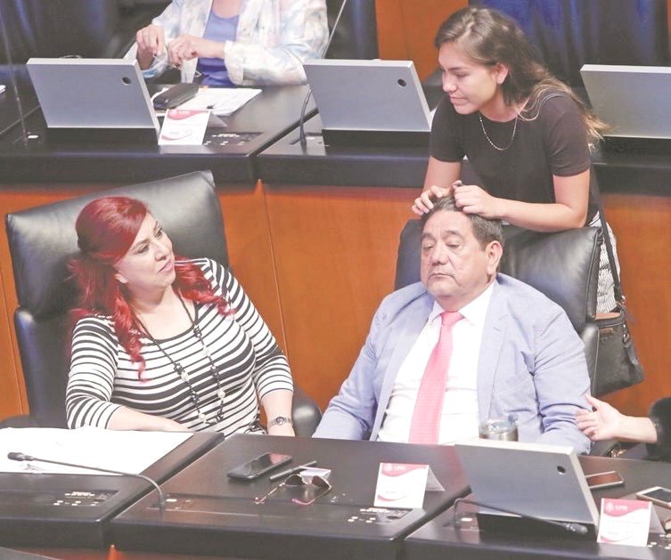 * El Universal publicó una foto del legislador de Morena justo cuando una joven mujer le acaricia el pelo mientras él está sentado en su sillón en el salón de sesiones del Senado