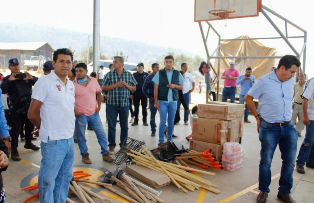 * El alcalde Antonio Gaspar visitó además Llanos de Tepoxtepec para verificar el estado de salud de los habitantes e hizo entrega de víveres, herramientas a quienes participan en los trabajos