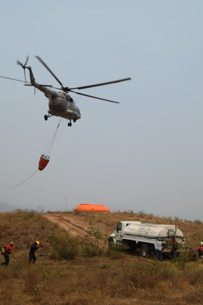 Los pilotos de la Semar, capitanes Eric Jiménez López y Eric Manuel Acosta Durán, comenzaron a realizar sobrevuelos en un helicóptero MI-17, equipado con un helibalde, un dispositivo similar a una cubeta que cuelga bajo el casco de la aeronave, donde se acarrea el agua para después liberarla sobre la zona del incendio.