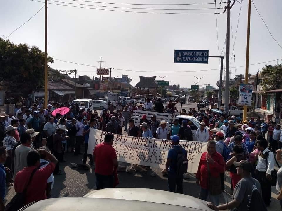 MARQUELIA.— Unos 500 habitantes me´phaa de la comunidad de Pueblo Hidalgo, perteneciente a San Luis Acatlán, bloquearon de manera intermitente la carretera Acapulco-Pinotepa Nacional en este municipio, donde atravesaron vehículos y colocaron una manta con sus exigencias.