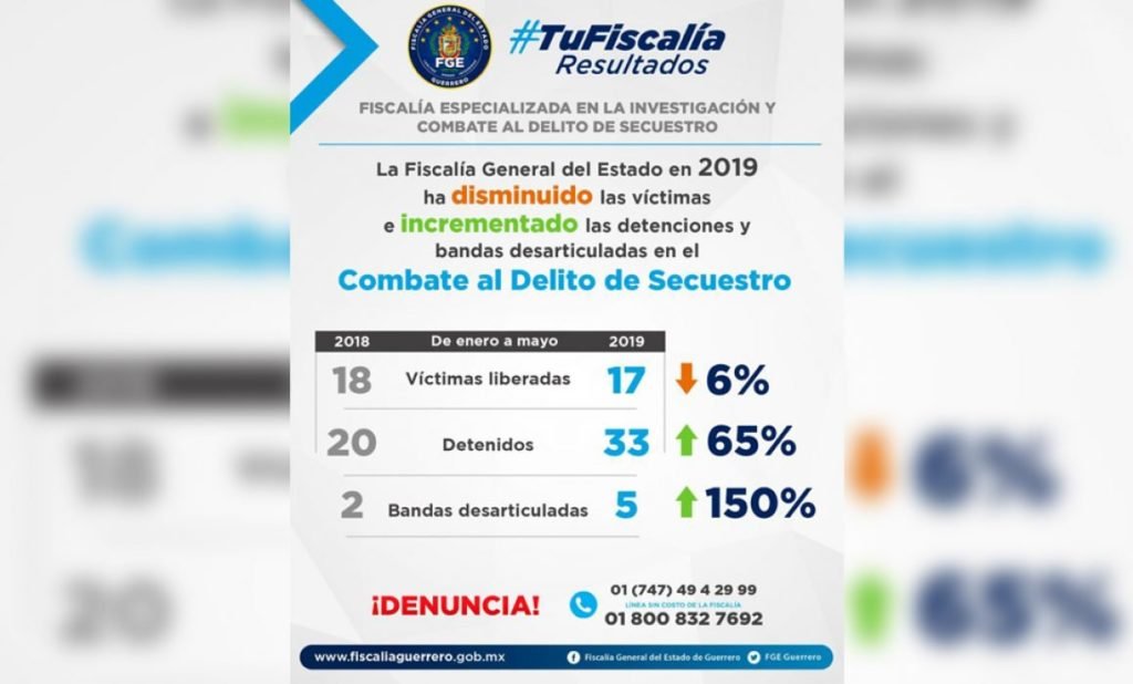 La FGE, detalló que durante los meses de enero a mayo del presente año, 17 víctimas de este delito fueron liberadas, se lograron 33 detenciones y cinco bandas delictivas quedaron desarticuladas, ello a comparación con el mismo período de 2018, donde 18 víctimas fueron liberadas, 20 los detenidos y dos bandas delictivas desarticuladas.