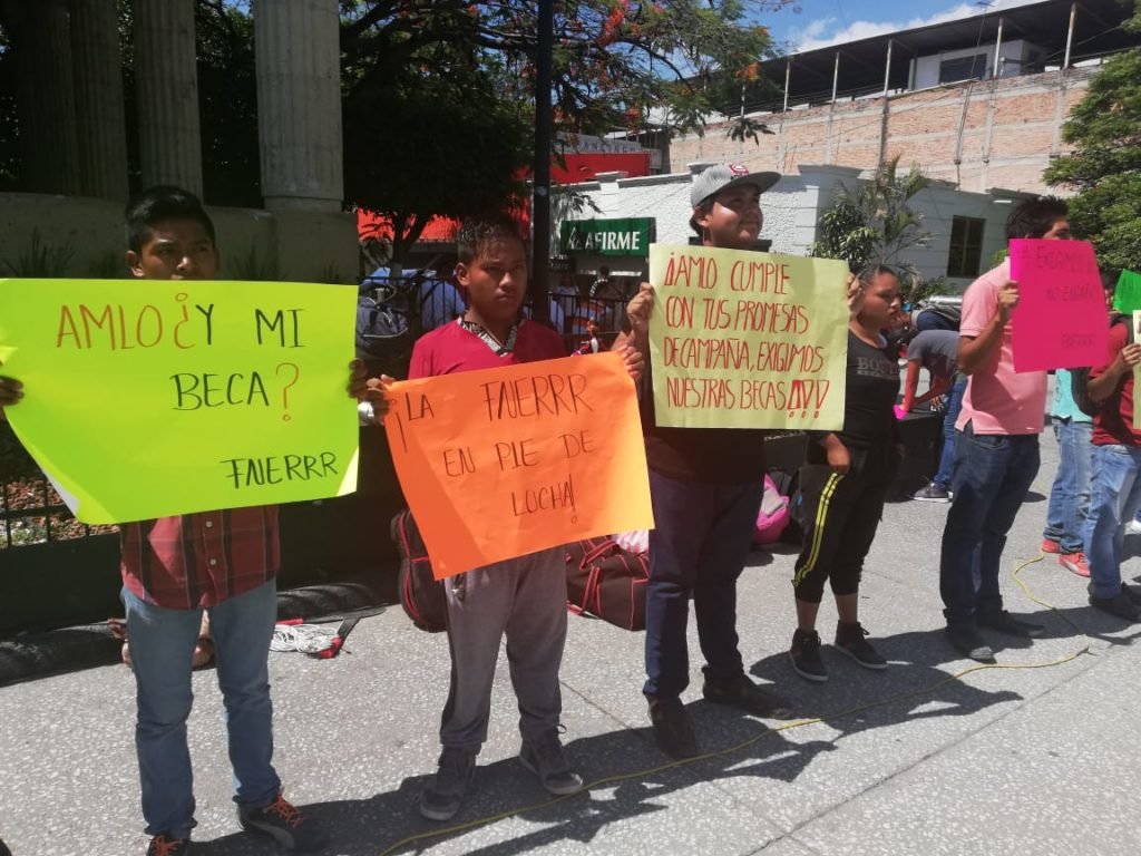 Los estudiantes mostraron pancartas con mensajes como: “AMLO cumple con tus promesas de campaña”, “FNERRR en pie de lucha” y “exigimos becas, no engaños”.