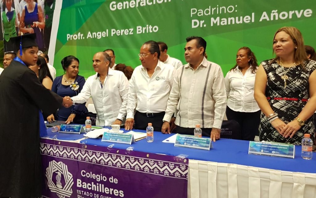 El senador Añorve, durante el evento en el que 196 alumnos concluyeron satisfactoriamente su formación académica en el nivel medio superior, agradeció la invitación que le hizo la directora del plantel, Lidia García Ramos para apadrinar a los egresados.