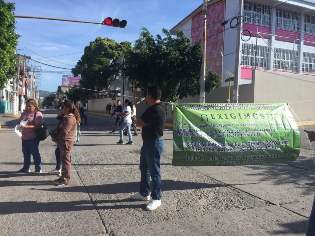 Docentes y padres de familia, acompañados por la dirigencia de la Sección 18 del Sindicato Único de Servidores Públicos del Estado de Guerrero (SUSPEG), bloquearon dos avenidas del centro para exigir a las autoridades la destitución del director de la Telesecundaria “Emiliano Zapata”, ubicada en la colonia CNOP, Germán Soto Lara, por presuntos actos de corrupción.
