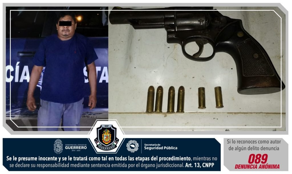 Se trató de Ricardo “N”, de 46 años de años de edad, el cual portaba una pistola tipo revolver, que contenía en el cilindro con cuatro cartuchos útiles calibre 38 Especial y 2 dos percutidos, por lo que fue puesto a disposición de las autoridades competentes.