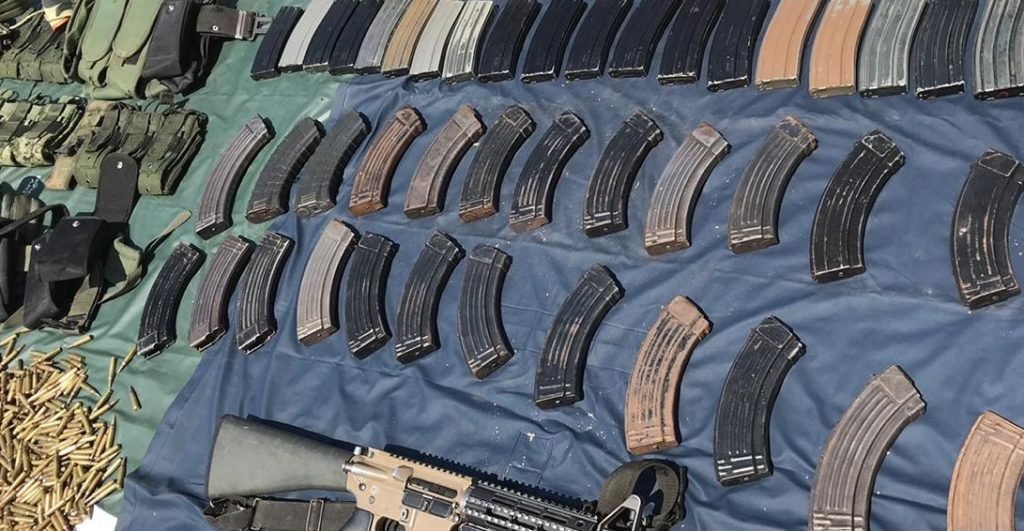 En tanto, en el lugar se logró el aseguramiento de lo siguiente: camioneta Mazda, CX-5, color rojo, placas PYV-1691 de Morelos; cuenta con reporte de robo en el Registro Público Vehicular (Repuve) de fecha 27 de junio de 2018. En su interior se localizó un fusil AR-15 con un aditamento lanzagranadas; un arma larga tipo M4, calibre .223mm, con un cargador abastecido con 30 cartuchos útiles; un mochila camuflada que contenía 1,729 cartuchos útiles calibre .223mm; 12 cargadores desabastecidos para calibre 7.62x39mm y 10 cargadores desabastecidos para calibre .223mm.