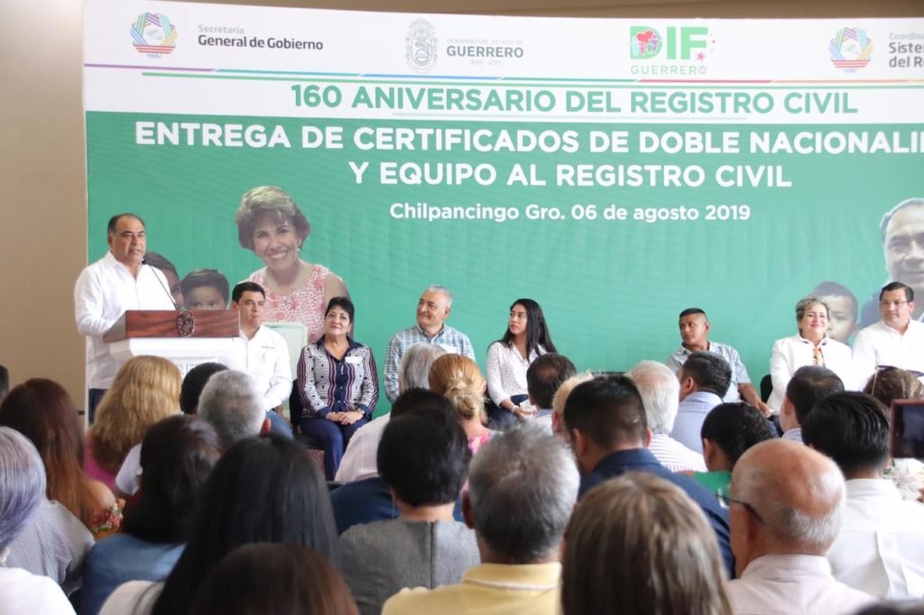 Al conmemorar el 160 Aniversario del Registro Civil en Guerrero, para fortalecer las acciones de identidad jurídica de los guerrerenses, el gobernador Héctor Astudillo Flores, entregó material y equipo a 20 oficialías por más de 1.8 millones de pesos, así como la expedición de la primer acta de nacimiento en sistema “Braille” a personas invidentes y 100 certificados de doble nacionalidad.