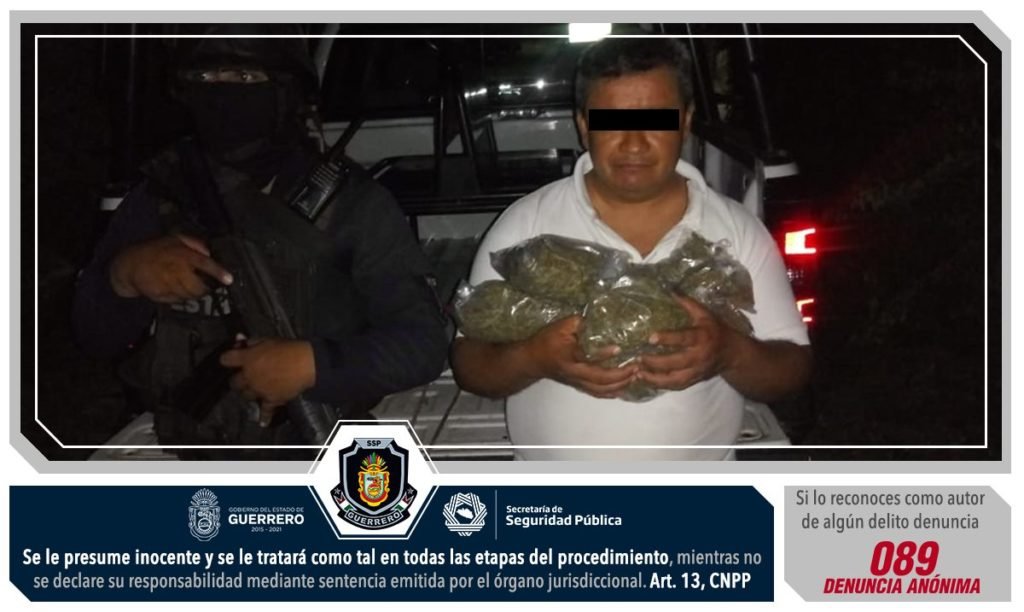 Elementos del Grupo de Operaciones Especiales “Jaguar” detuvieron a un sujeto que portaba 5 bolsas y 6 envoltorios con marihuana dentro de una cubeta, en una de las calles del municipio de Petatlán.