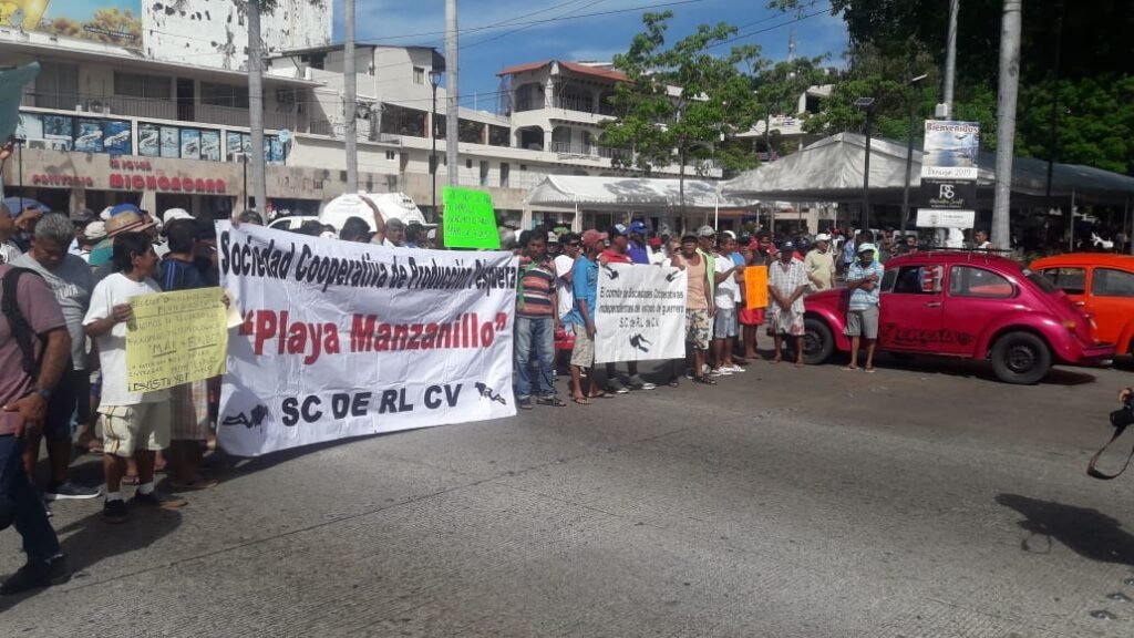 ACAPULCO.— Buzos y pescadores de 10 cooperativas del puerto bloquearon la avenida Costera frente a la tienda departamental Sanborns de la colonia Centro, para exigir al gobierno del estado el pago del apoyo económico por las afectaciones provocadas por el mar de fondo y la marea roja.