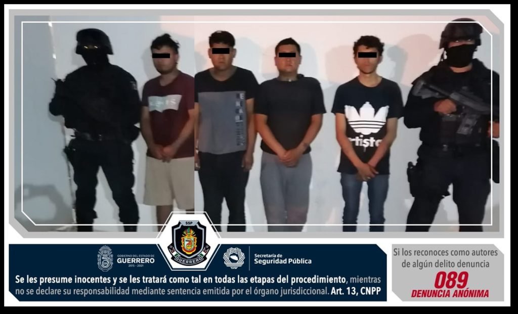 En otro caso, policías estatales de la Unidad de Fuerzas Especiales y personal de la Policía Cibernética capturaron a 5 sujetos, uno de ellos de 17 años, los cuales estaban en la colonia Huacapita de Chilpancingo. A estas personas se les aseguró armamento de uso exclusivo del Ejército, Armada y Fuerza Aérea, marihuana, una motocicleta, y un vehículo de la marca Ford, tipo Fusión, con placas de circulación PRP2207 del estado de Michoacán, presuntamente está relacionada con hechos delictivos registrados en los últimos días en esta ciudad.