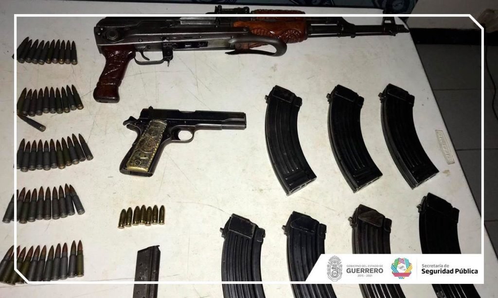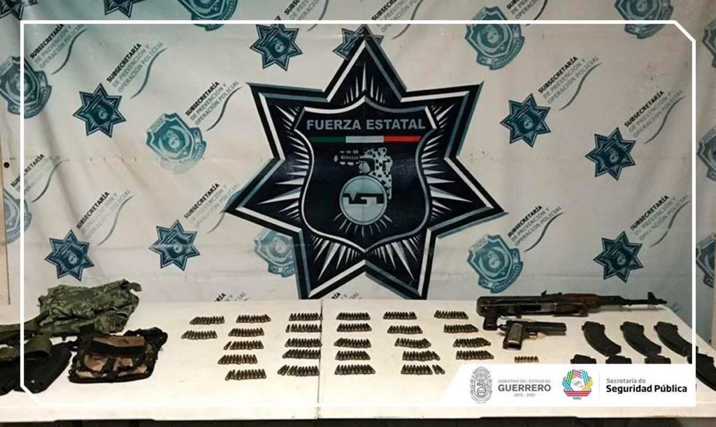 En tanto, en San Luis la Loma, también del municipio de Tecpan de Galeana, fue asegurada una unidad motriz marca Kia, tipo Sportage, modelo 2018, color rojo, placas de circulación PZT4593 del estado de Morelos, que fue identificada con reporte de robo en el REPUVE de fecha 24 de diciembre de 2018. Al realizar una revisión en su interior, se localizó un arma de fuego larga AK-47, con un cargador abastecido con 25 cartuchos útiles; una fornitura tipo militar que contenía seis cargadores abastecidos con 25 cartuchos útiles calibre 7.62x39mm cada uno; un uniforme tipo militar; una mochila tipo mariconera pixeleada que contenía 95 cartuchos a granel, y un arma corta de fuego marca Colt, 38 Súper, con un cargador abastecido con siete cartuchos útiles.